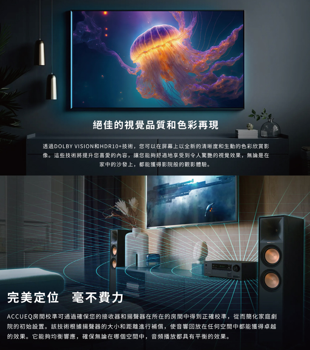 影像方面支援 4K/8K 訊號,並提供 1080p→4K/8K 升頻,搭配對應的 ULTRA High Speed HDMI 線即可發揮。聲音設定同樣不複雜,內建AccuEQ 會自動量測空間、調好每支喇叭;想玩環繞,小客廳也能以 3.1.2 Atmos 體驗高度聲場。