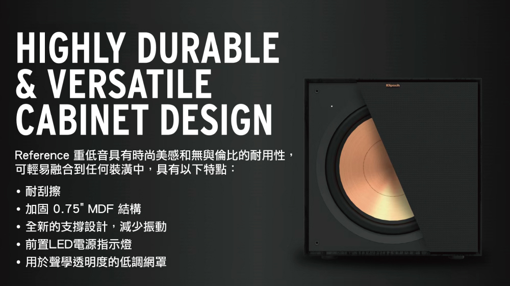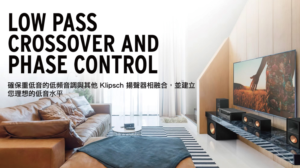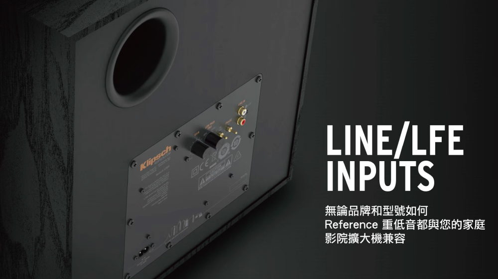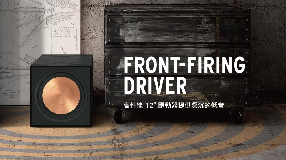 Klipsch R-121SW 配備 12 吋高衝程 TCP 錐盆與全數位擴大,提供 200W 連續/400W 峰值輸出,最大 118dB,頻率範圍 28–120Hz。前發聲單體結合後置反射孔,兼顧量感與擺位彈性;低通分頻、0/180° 相位與音量可調,能快速與主喇叭與房間響應融合。