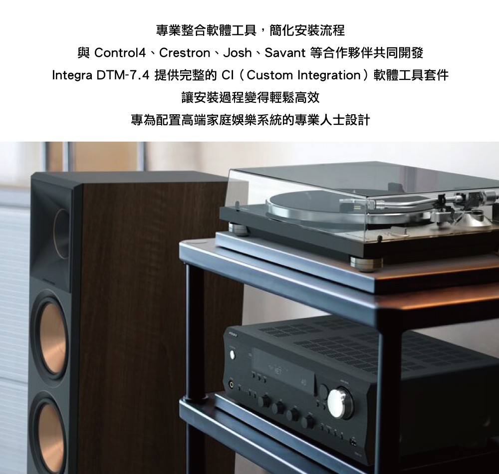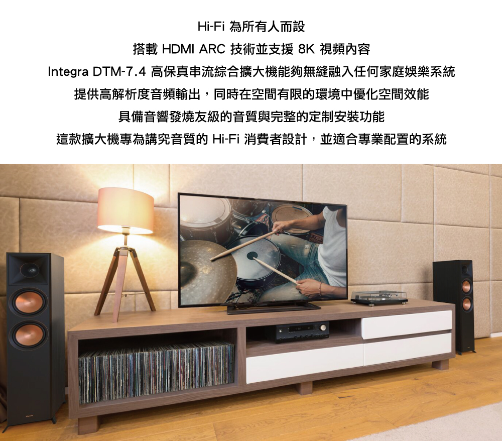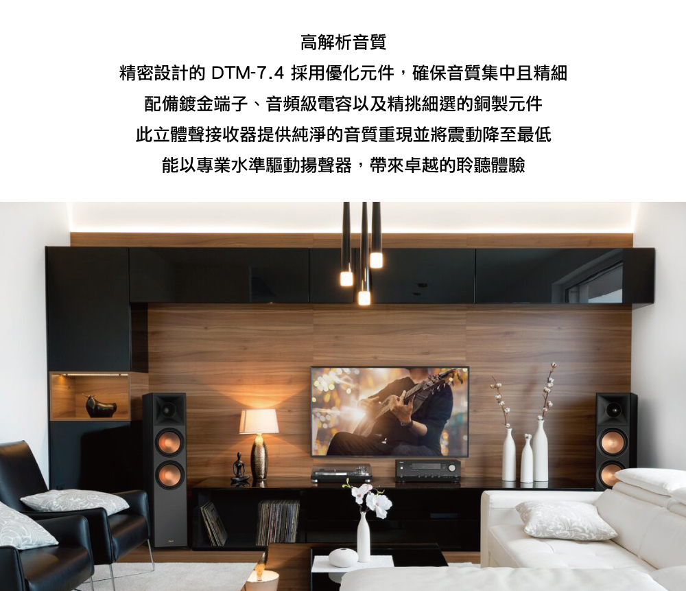 連線方面,Roon Ready、Chromecast built-in、AirPlay 2 與 Spotify/Amazon Music HD/TIDAL/Deezer/Pandora/TuneIn 等服務一應俱全;日常播放可用 藍牙接收(SBC/AAC) 直接推歌。針對整宅安裝,DTM-7.4 具 Web 設定、RS-232/IR/12V 觸發 與 遠端診斷,並能 Works with Sonos 同步電源與音量。用一台,完成客廳電視牆與兩聲道的高品質整合。