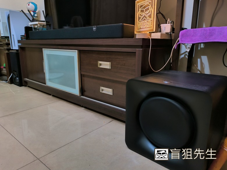 SUB 100 10"重低音其實不算太重,木質的外箱搭配前方的金屬網罩保護低音紙盆,圓弧造型看起來很有居家的萌感。底部則有四個膠墊做基礎防震止滑之用。關鍵是不要放在有中空的櫃子上,放地上或者放在黑金石板上會比較好,低音更乾淨。如果覺得觀影過程中想單獨降低SUB 100的量感,還可以進手機App\SETTINGS\重低音來調整。