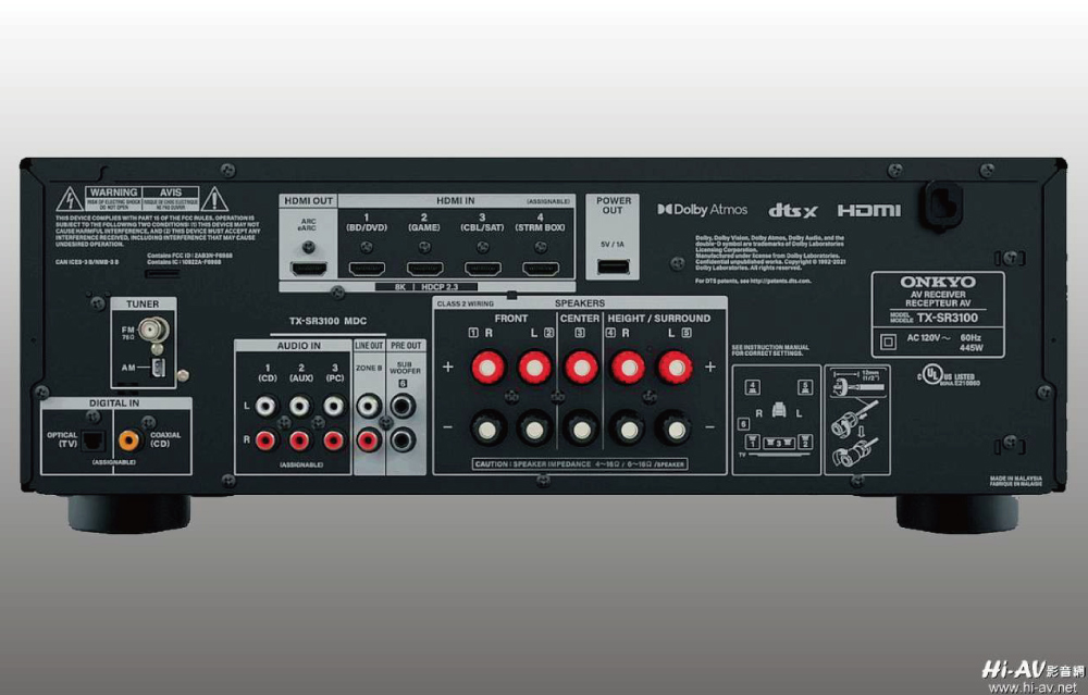 Onkyo TX-SR3100的背板,由於是5.2聲道設計,背板比更多輸出的環擴精簡許多,但包括數位音訊輸入、類比音訊輸入、B區音訊輸出、超低音信號輸出、甚至USB供電埠等設計都很齊備。更值得注意的是,背板四進一出的HDMI端子都是HDMI 2.1/HDCP2.3規範對應,HDMI輸出也有ARC與eARC對應,可以無礙傳輸8K60p/4K120p的最新規格,幾年內都不會落伍。