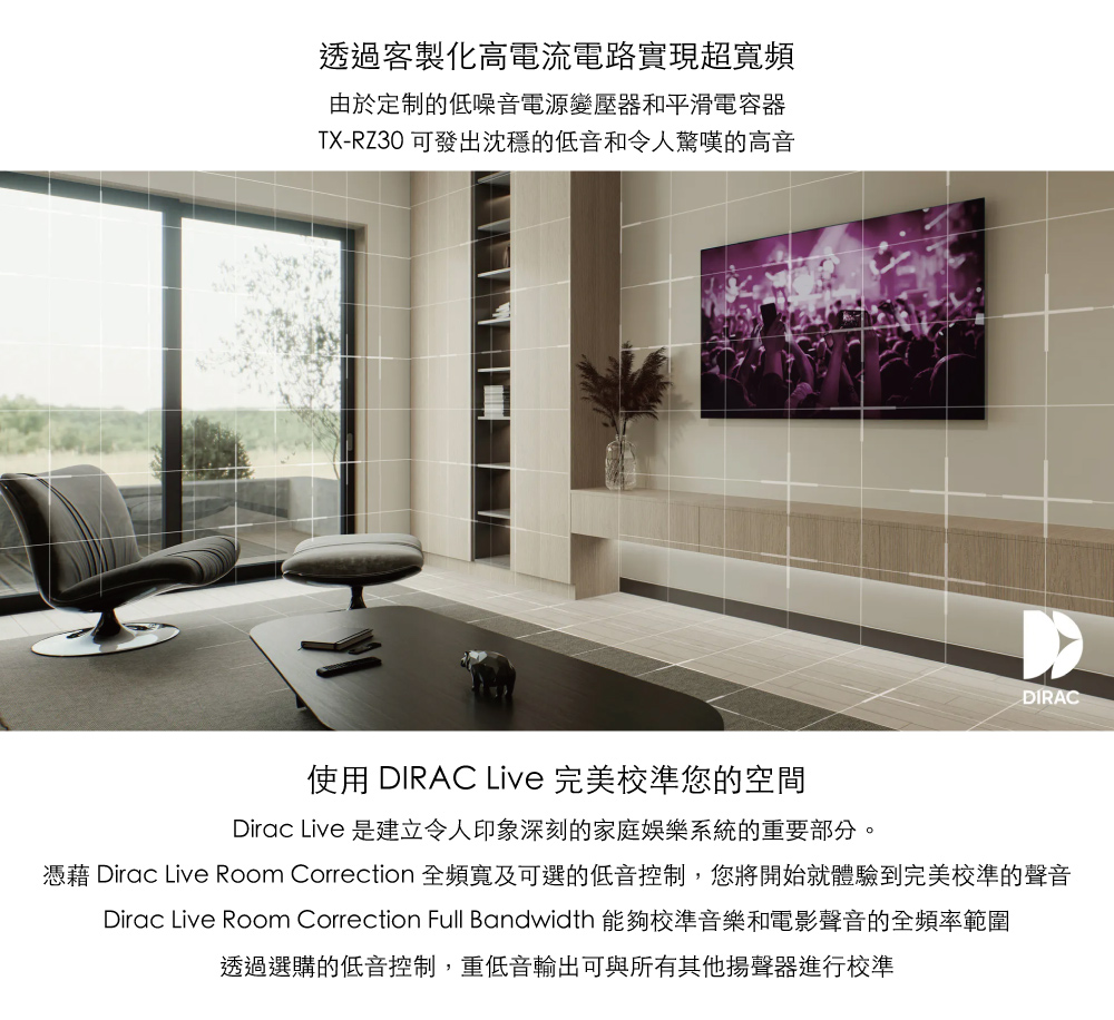 A:優先選有 Dirac Live 的型號:NR7100/RZ50/RZ70。RZ70 校正頻段最完整;有多顆重低音可再加 Bass Control。