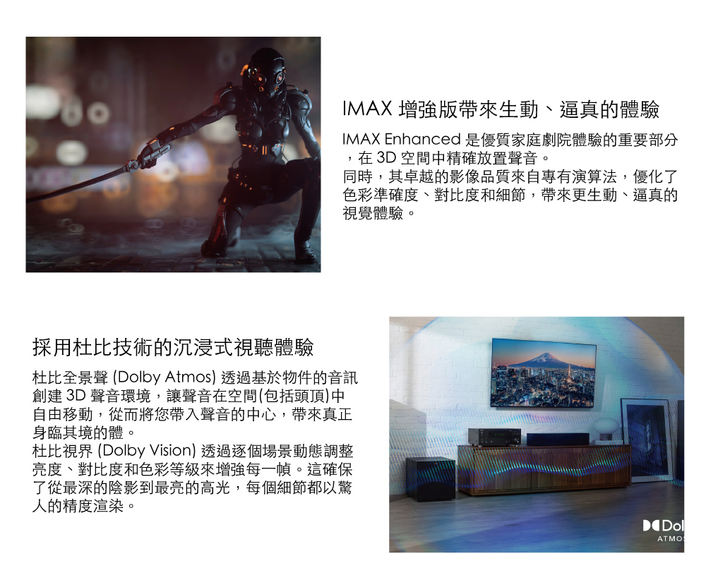 夜間追劇開 THX Loudness Plus,小音量也有層次;大片場面啟用 IMAX Mode,衝擊力直接拉滿。影像端具 4K/8K 升頻+超解像,讓一般串流和藍光畫面更乾淨。