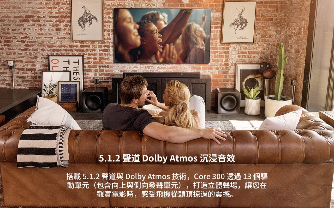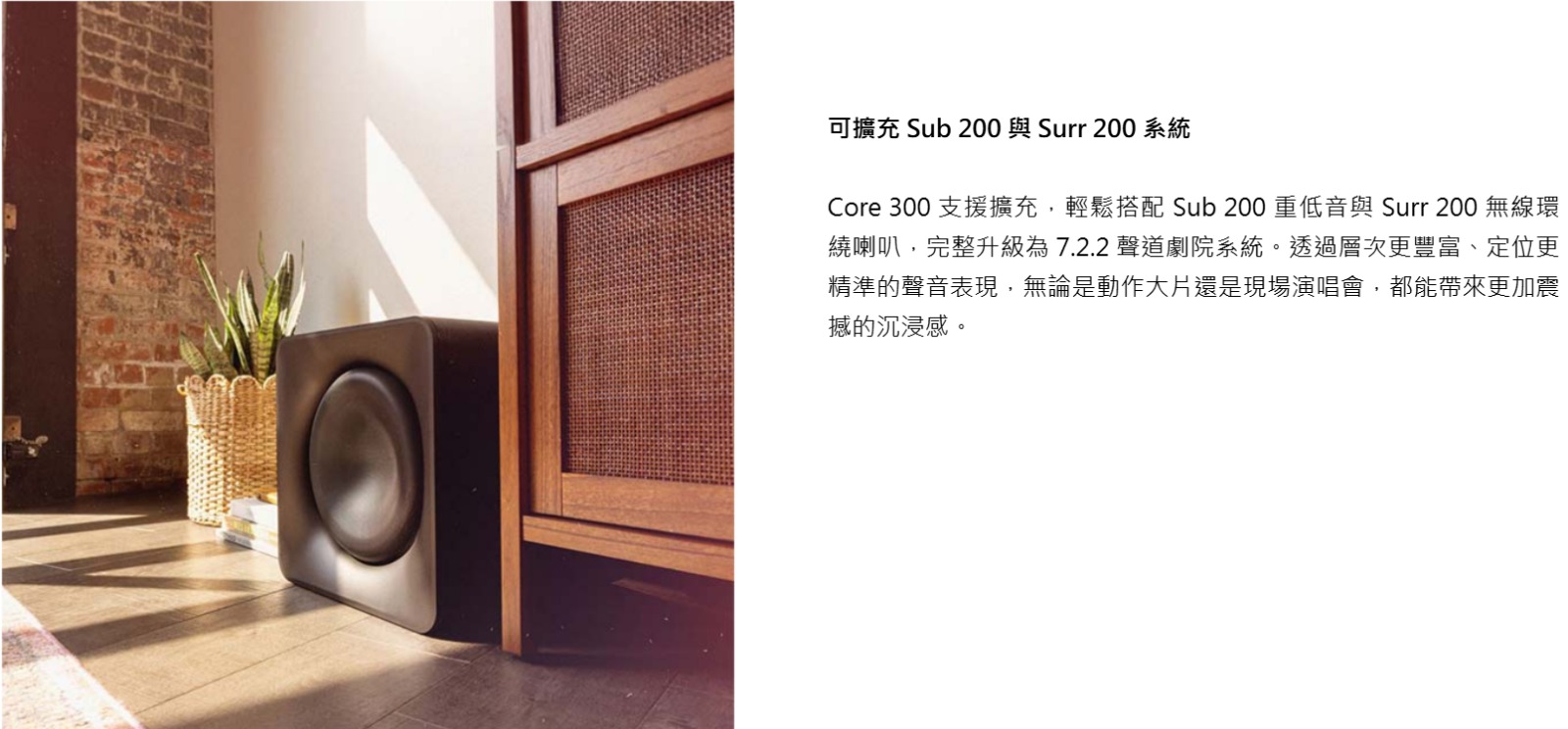 若要再擴張舞台,Core 300 可以支援 無線擴充 Surround/Sub,在保持整潔佈線的同時,把客廳瞬間升級為更接近電影院的沉浸體驗。