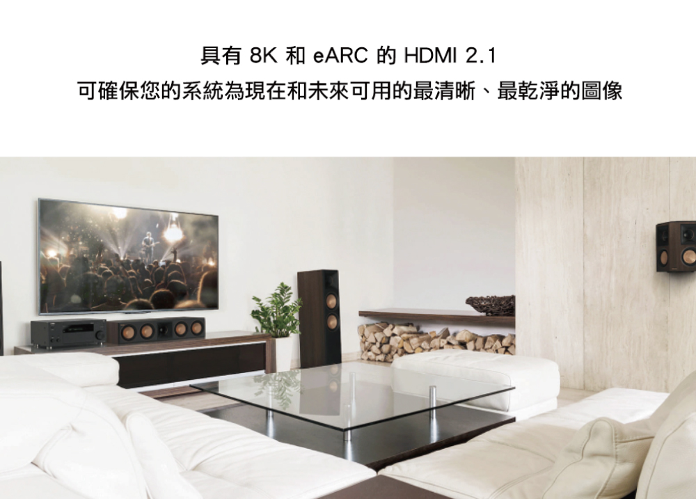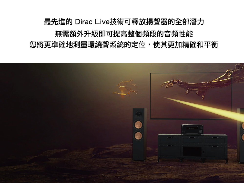校正方面有 Dirac Live 與 AccuReflex,自動量測房間與高度相位,對白更清楚、定位更精準。影像端 HDMI 2.1(8K/60・4K/120) 搭配 HDR10+/Dolby Vision,玩 PS5/Xbox 或看串流都更滑順;eARC 讓電視 Netflix/Disney+ 多聲道一線回傳。