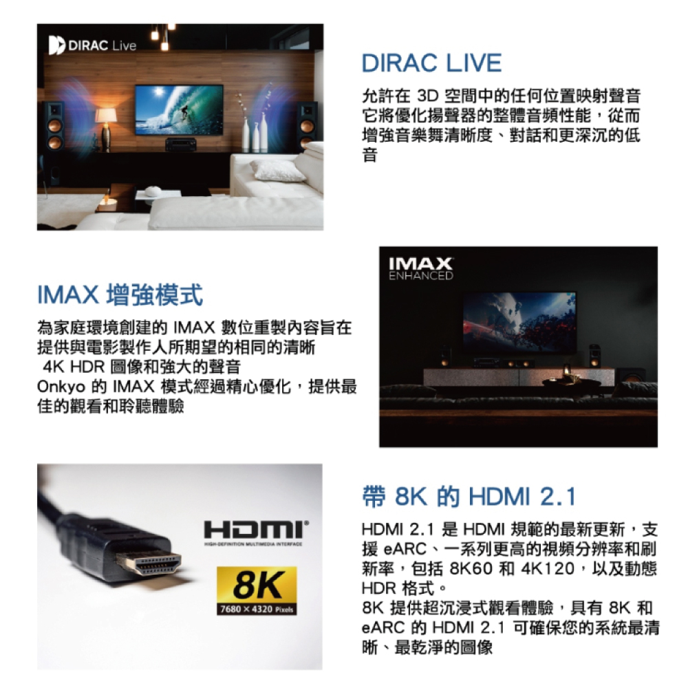 影像端升級 HDMI 2.1,可通過 8K/60 與 4K/120,支援 HDR10+/Dolby Vision 與 QMS;接電視只要一條線,eARC 就能把串流 App 的多聲道回傳到擴大機。