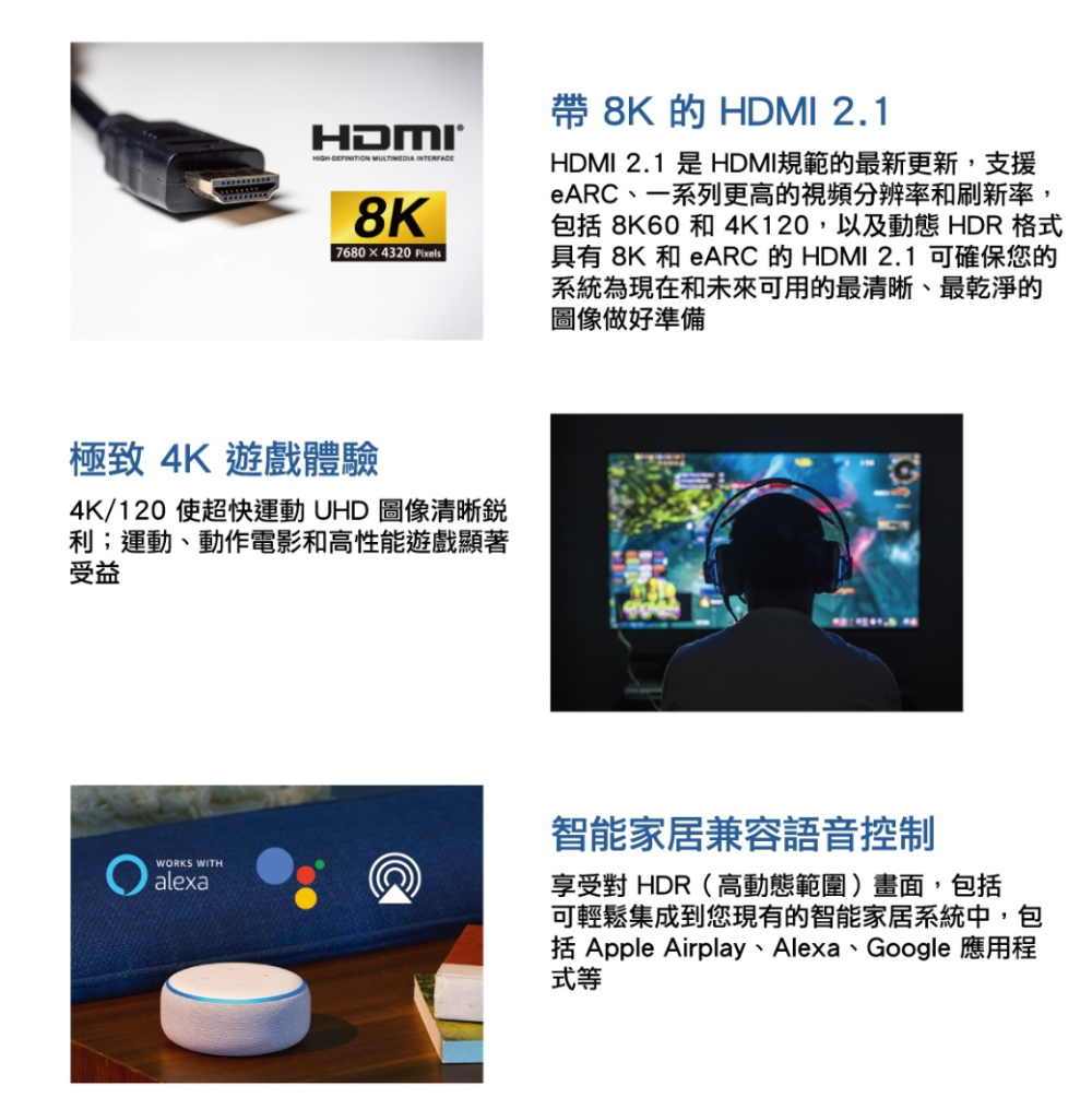 影像端具備 HDMI 2.1,可通過 8K/60 與 4K/120,並支援 HDR10+/Dolby Vision,細節與動態範圍一次到位;接電視只要一條線,eARC 可回傳 Netflix、Disney+ 等 App 的多聲道音訊,安裝更俐落。