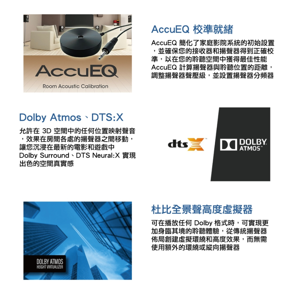 聲音端內建 Dolby Atmos/DTS:X,再搭配 AccuEQ 自動校正(含麥克風),能自動量測喇叭尺寸、距離與分頻,快速形成包圍感。