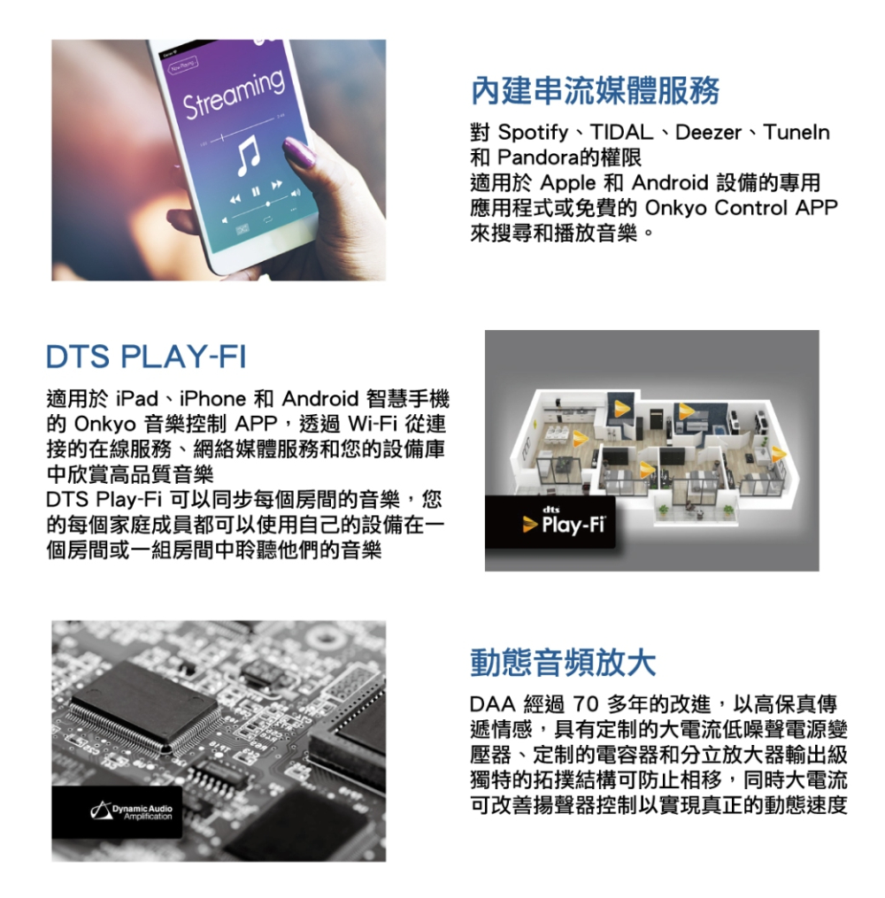 玩家關心的 VRR/ALLM/QFT 也支援,降低延遲、減少畫面撕裂。日常聽歌,內建 Wi-Fi/藍牙,支援 AirPlay 2、Chromecast、Spotify、TIDAL,亦能播放 Hi-Res192k/24bit 與 DSD 檔。需要多空間播放,Zone B Line Out 可把同一來源送到書房或耳機發射器;也能融入 Works with Sonos/DTS Play-Fi 的全屋音樂。